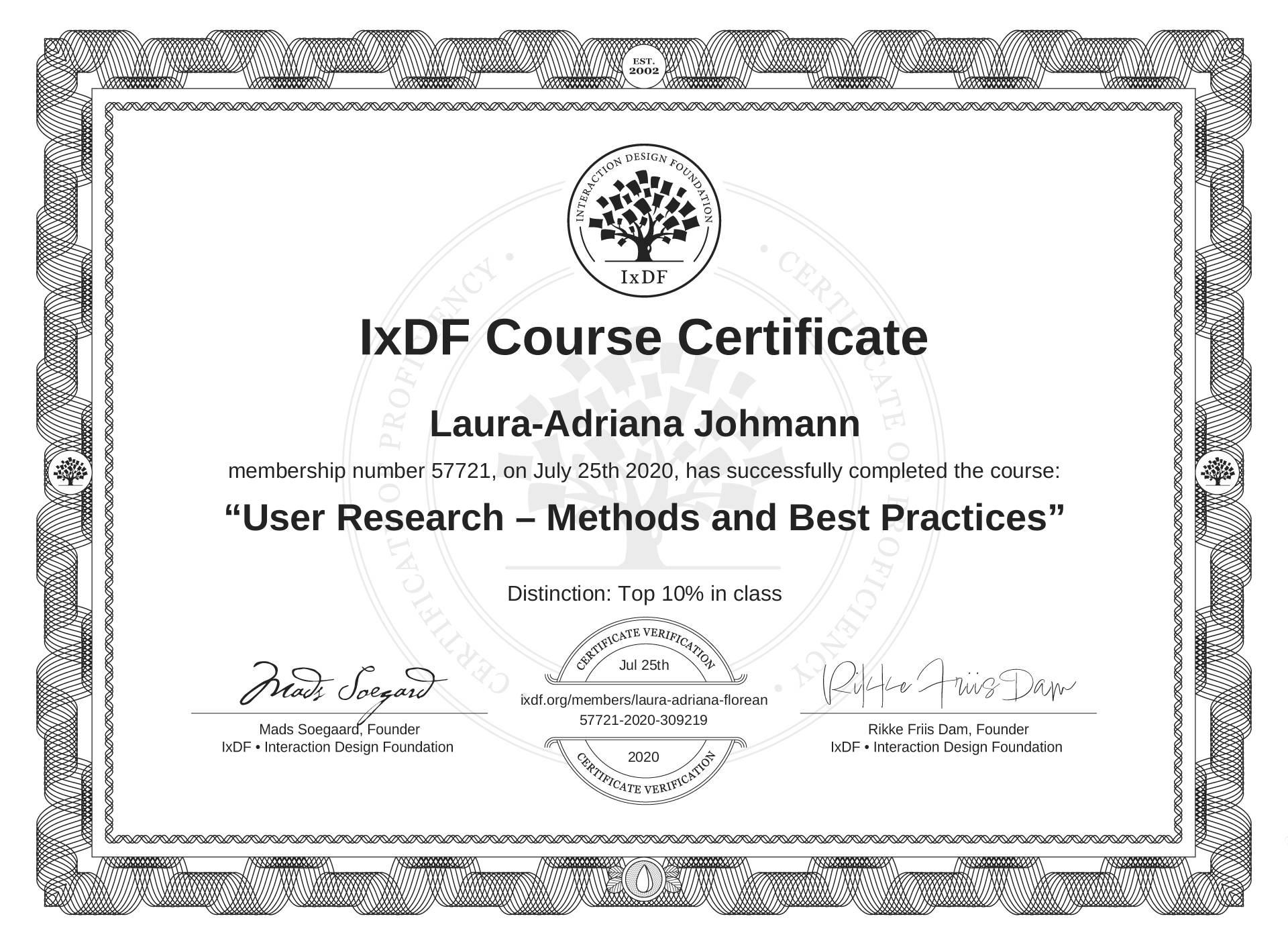 The IxDF Course Certificate above is awarded to Laura-Adriana Johmann with a Top 10% Distinction in formal recognition of their coursework surpassing the rigorous benchmarks of exceptional performance established by the IxDF Educational Codex.