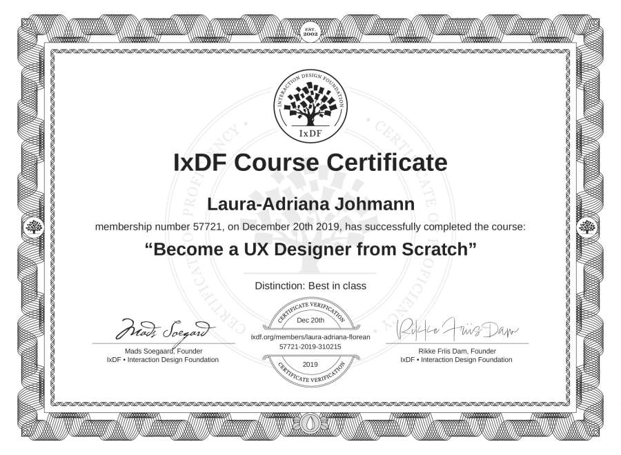 The IxDF Course Certificate above is awarded to Laura-Adriana Johmann with a Best in Class Distinction in formal recognition of their coursework surpassing the rigorous benchmarks of exceptional performance established by the IxDF Educational Codex.