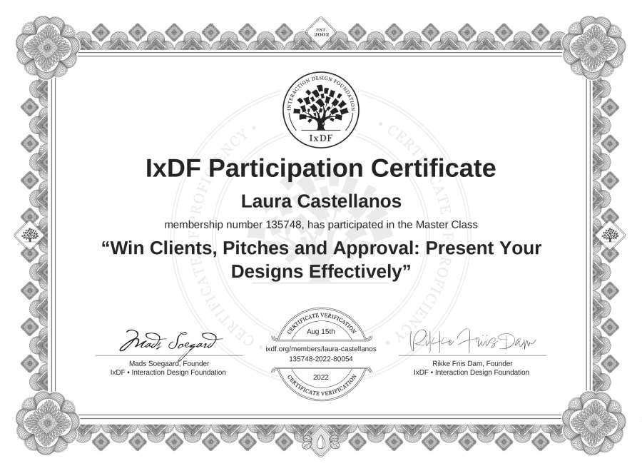Laura Castellanos's IxDF Masterclass Certificate: Win Clients, Pitches and Approval: Present Your Designs Effectively
