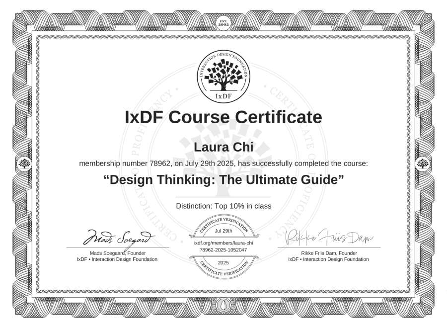 The IxDF Course Certificate above is awarded to Laura Chi with a Top 10% Distinction in formal recognition of their coursework surpassing the rigorous benchmarks of exceptional performance established by the IxDF Educational Codex.