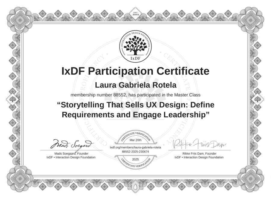 Laura Gabriela Rotela's IxDF Masterclass Certificate: Storytelling That Sells UX Design: Define Requirements and Engage Leadership
