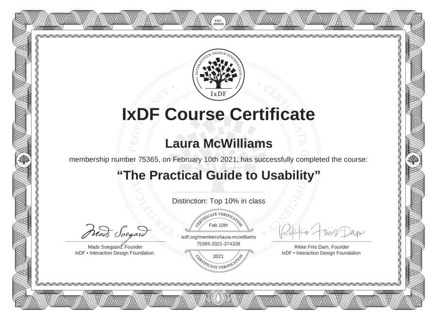 Laura McWilliams's IxDF Course Certificate: The Practical Guide to Usability