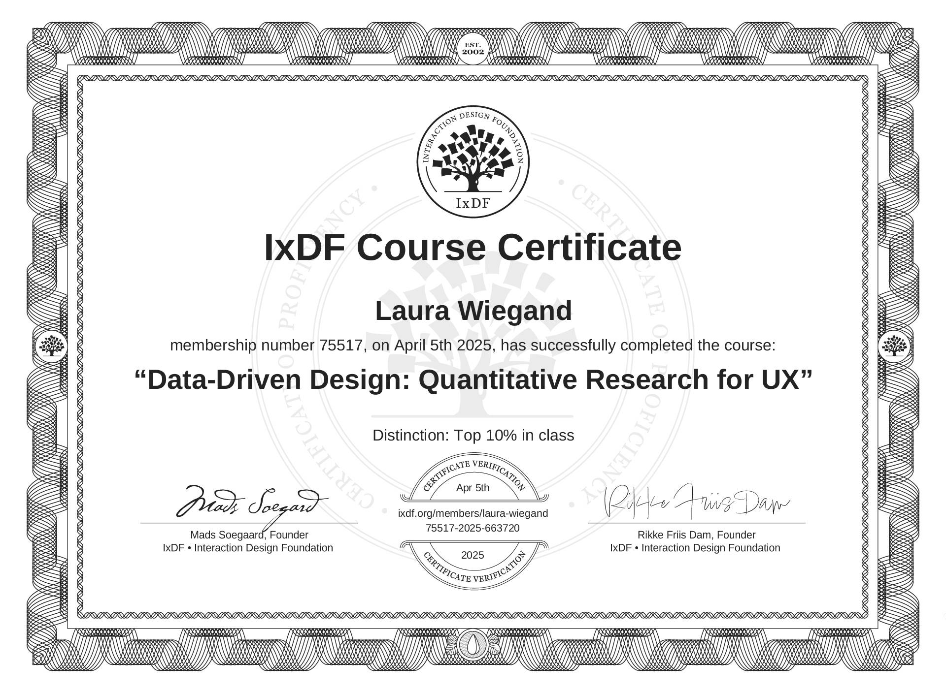 The IxDF Course Certificate above is awarded to Laura Wiegand with a Top 10% Distinction in formal recognition of their coursework surpassing the rigorous benchmarks of exceptional performance established by the IxDF Educational Codex.