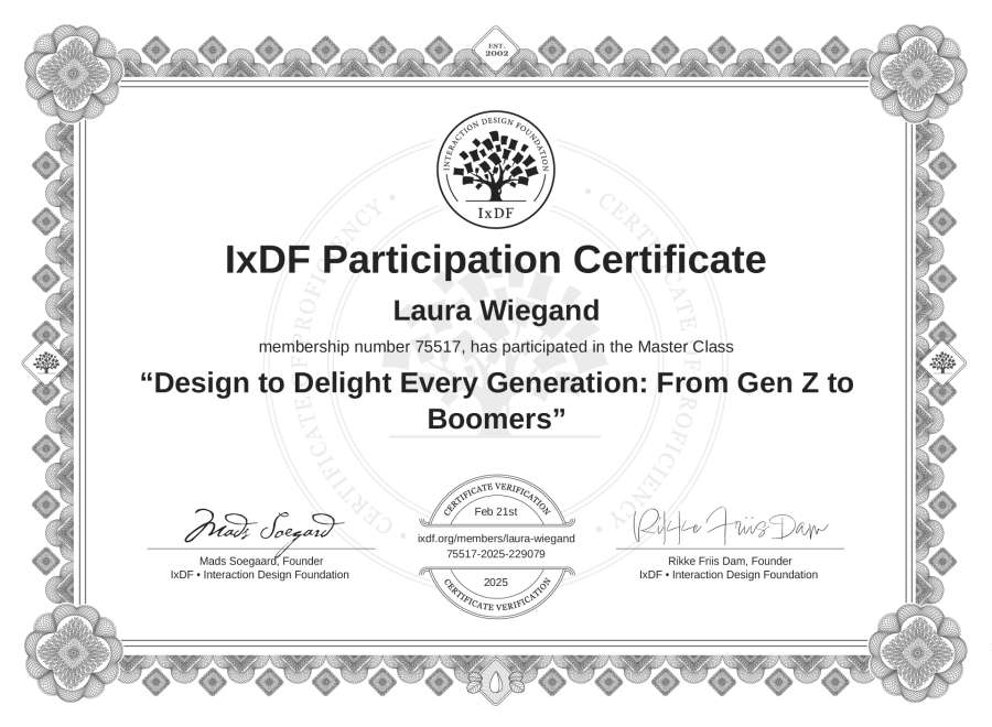 Laura Wiegand's IxDF Masterclass Certificate: Design to Delight Every Generation: From Gen Z to Boomers