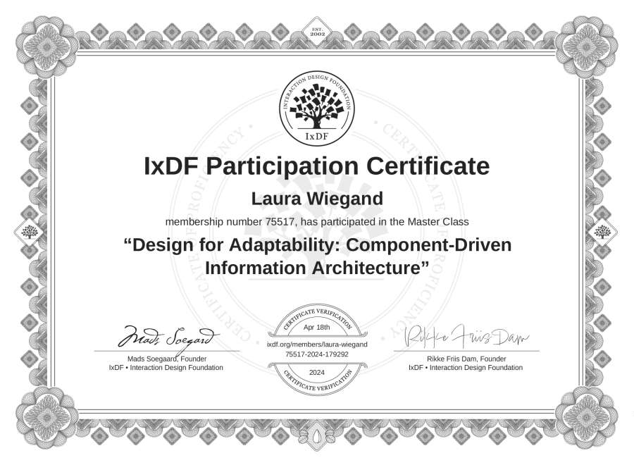Laura Wiegand's IxDF Masterclass Certificate: Design for Adaptability: Component-Driven Information Architecture