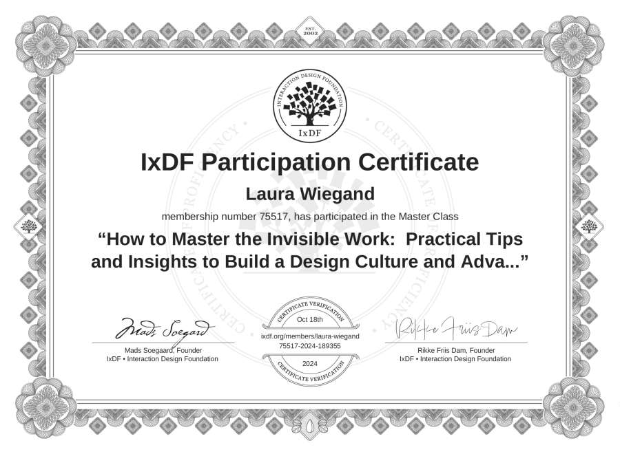 Laura Wiegand's IxDF Masterclass Certificate: How to Master the Invisible Work: Practical Tips and Insights to Build a Design Culture and Advance Your Career