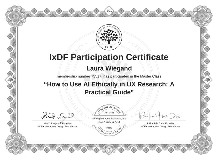 Laura Wiegand's IxDF Masterclass Certificate: How to Use AI Ethically in UX Research: A Practical Guide