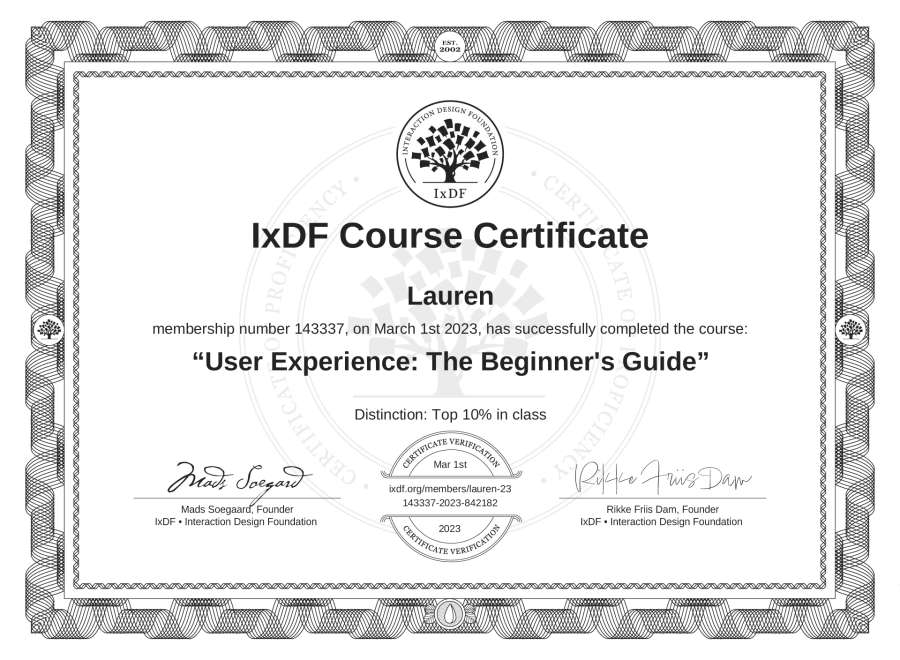 The IxDF Course Certificate above is awarded to Lauren with a Top 10% Distinction in formal recognition of their coursework surpassing the rigorous benchmarks of exceptional performance established by the IxDF Educational Codex.