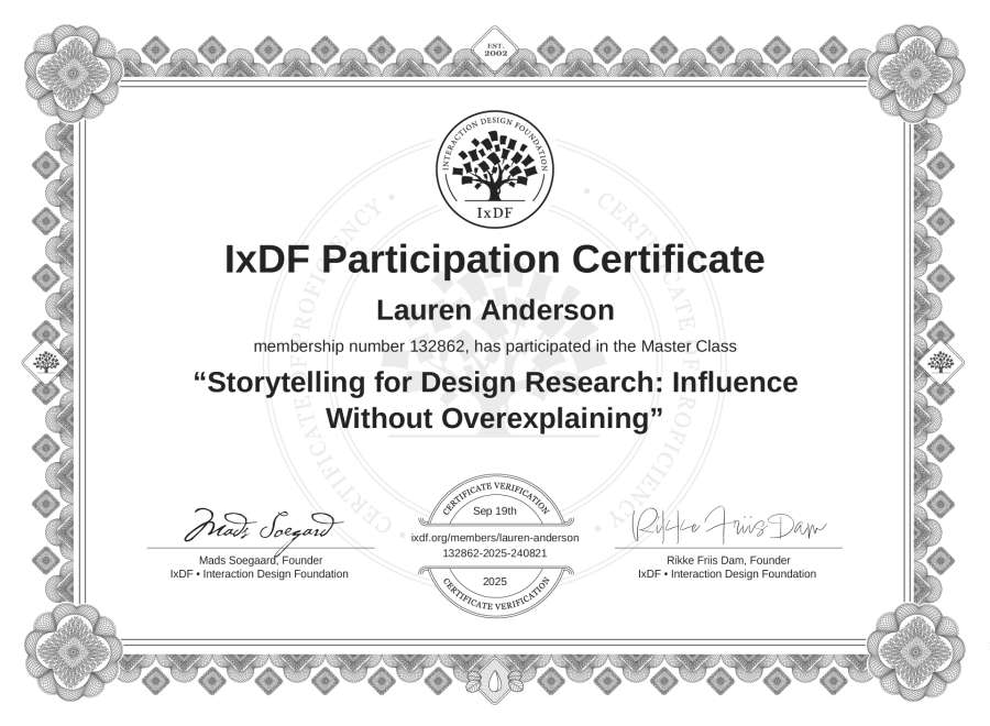 Lauren Anderson's IxDF Masterclass Certificate: Storytelling for Design Research: Influence Without Overexplaining