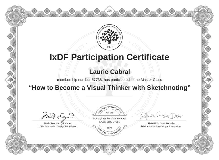 Laurie Cabral's IxDF Masterclass Certificate: How to Become a Visual Thinker with Sketchnoting