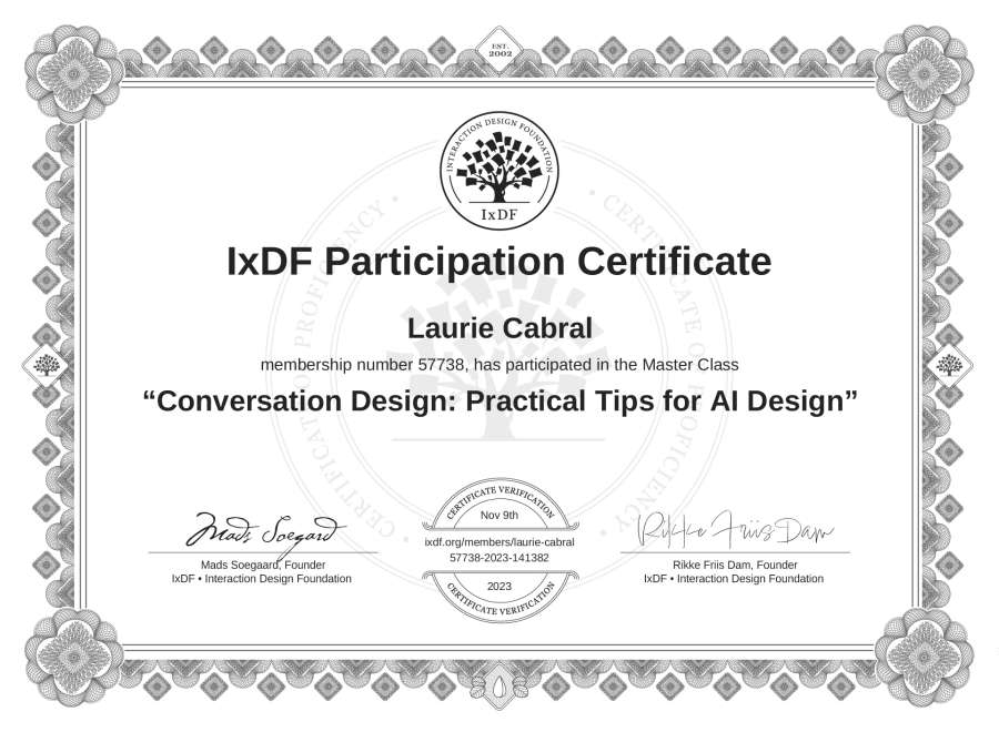 Laurie Cabral's IxDF Masterclass Certificate: Conversation Design: Practical Tips for AI Design