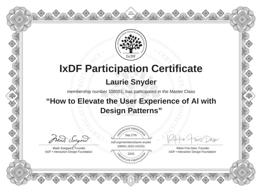 Laurie Snyder's IxDF Masterclass Certificate: How to Elevate the User Experience of AI with Design Patterns