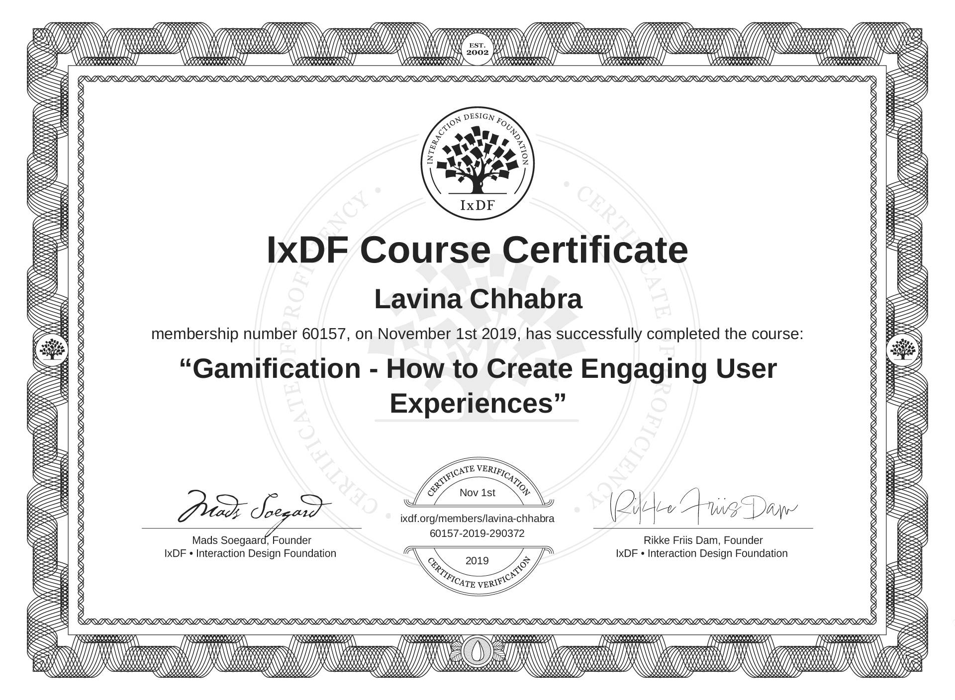 Lavina Chhabra's IxDF Course Certificate: Gamification - How to Create Engaging User Experiences