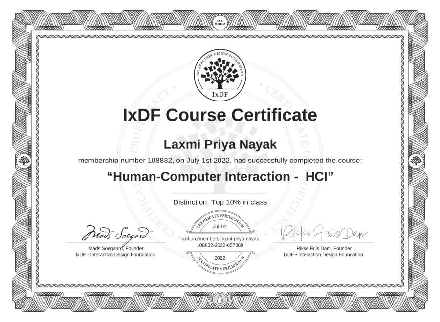 The IxDF Course Certificate above is awarded to Laxmi Priya Nayak with a Top 10% Distinction in formal recognition of their coursework surpassing the rigorous benchmarks of exceptional performance established by the IxDF Educational Codex.