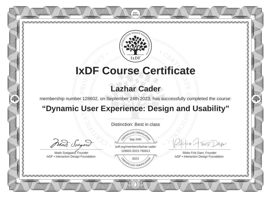 The IxDF Course Certificate above is awarded to Lazhar Cader with a Best in Class Distinction in formal recognition of their coursework surpassing the rigorous benchmarks of exceptional performance established by the IxDF Educational Codex.