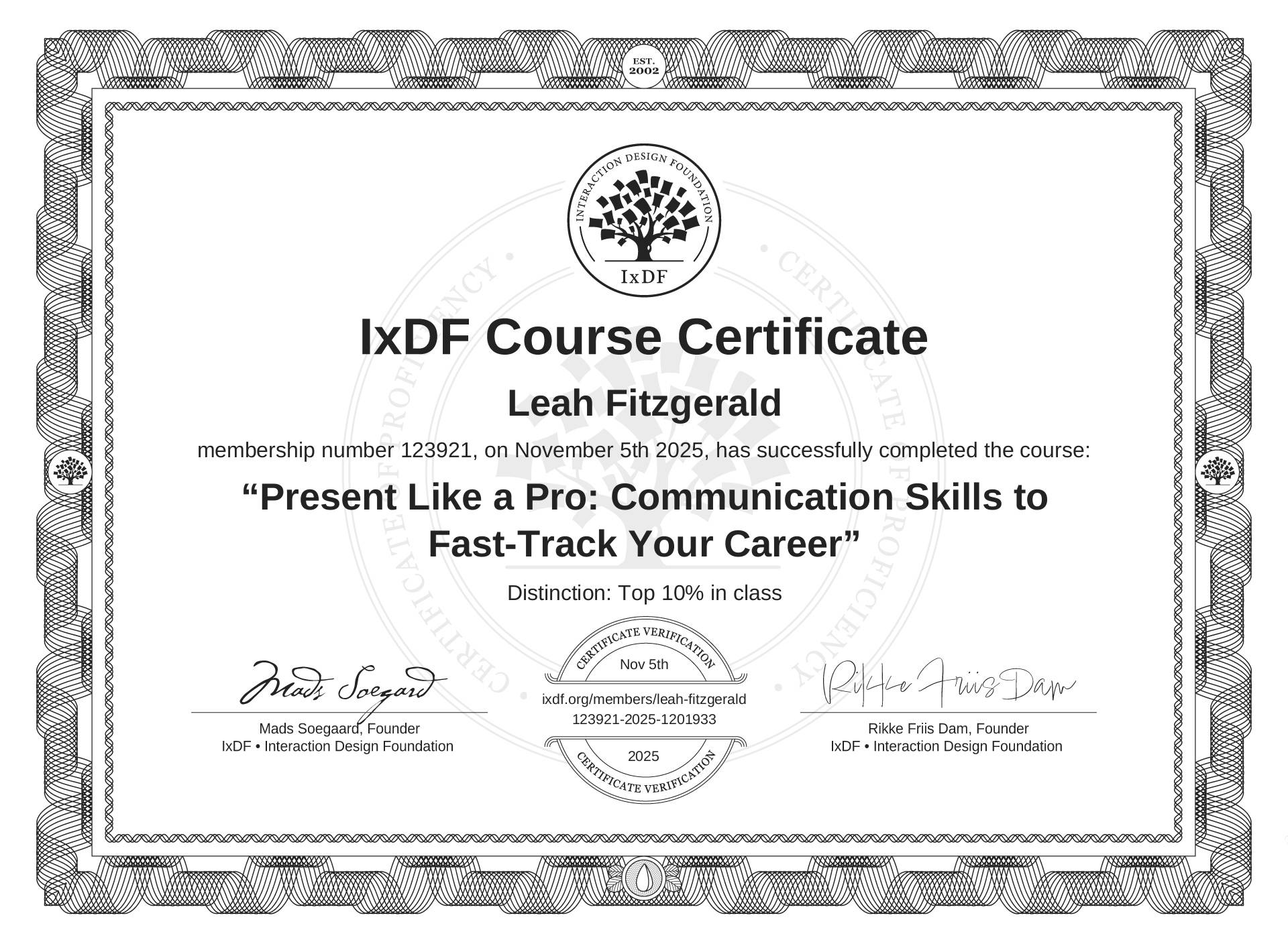 The IxDF Course Certificate above is awarded to Leah Fitzgerald with a Top 10% Distinction in formal recognition of their coursework surpassing the rigorous benchmarks of exceptional performance established by the IxDF Educational Codex.