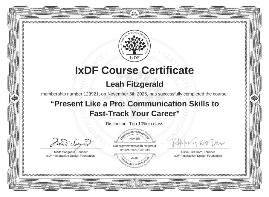 Leah Fitzgerald's IxDF Course Certificate: Present Like a Pro: Communication Skills to Fast-Track Your Career