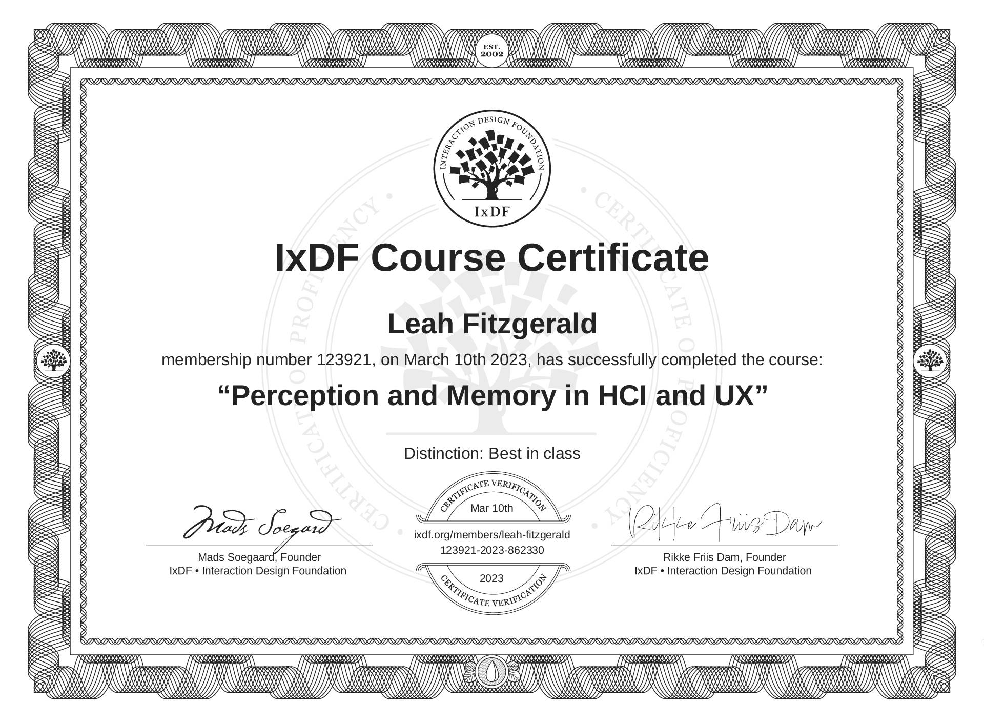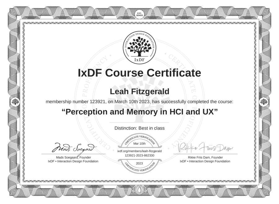 Leah Fitzgerald's IxDF Course Certificate: Perception and Memory in HCI and UX