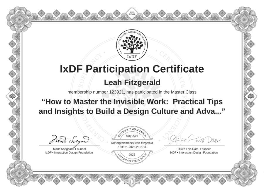 Leah Fitzgerald's IxDF Masterclass Certificate: How to Master the Invisible Work: Practical Tips and Insights to Build a Design Culture and Advance Your Career