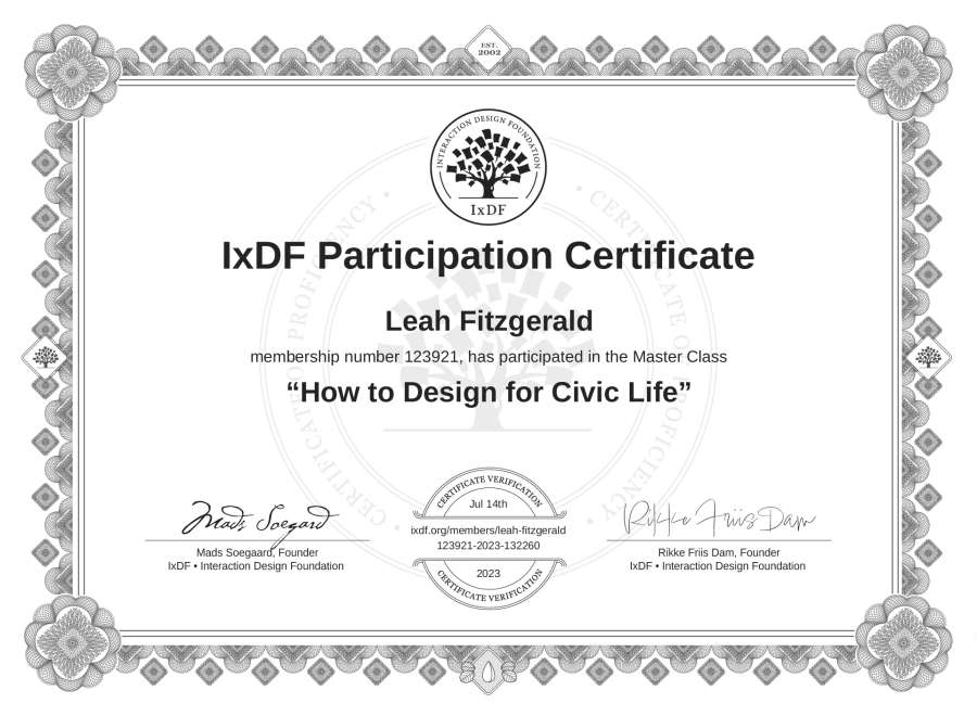 Leah Fitzgerald's IxDF Masterclass Certificate: How to Design for Civic Life