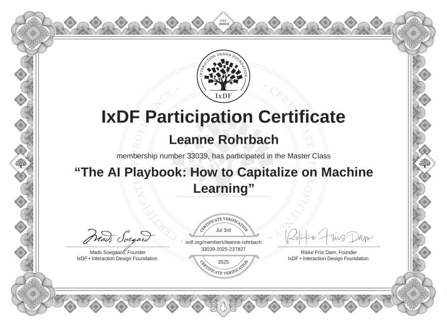 Leanne Rohrbach's IxDF Masterclass Certificate: The AI Playbook: How to Capitalize on Machine Learning