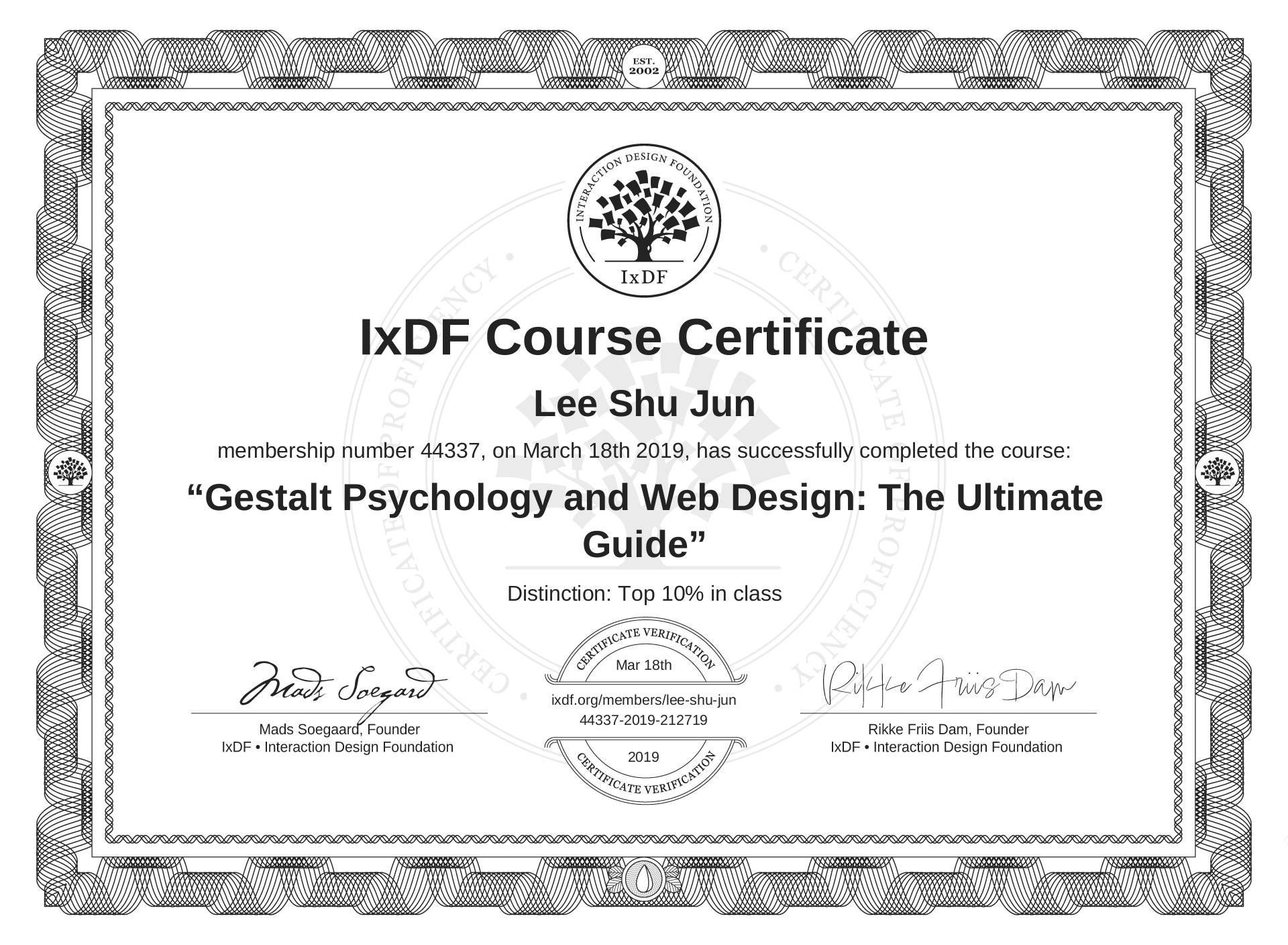 The IxDF Course Certificate above is awarded to Lee Shu Jun with a Top 10% Distinction in formal recognition of their coursework surpassing the rigorous benchmarks of exceptional performance established by the IxDF Educational Codex.