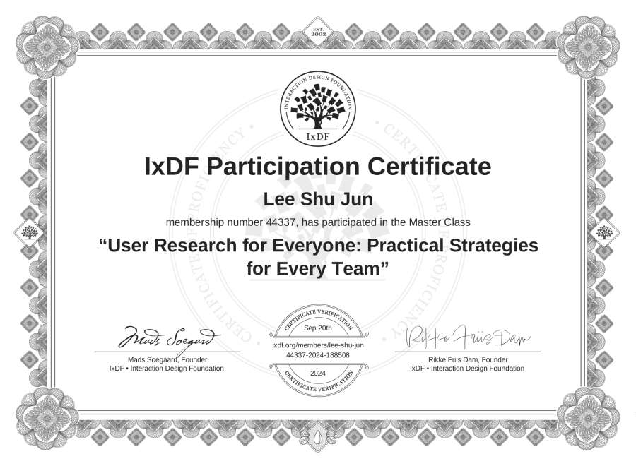 Lee Shu Jun's IxDF Masterclass Certificate: User Research for Everyone: Practical Strategies for Every Team