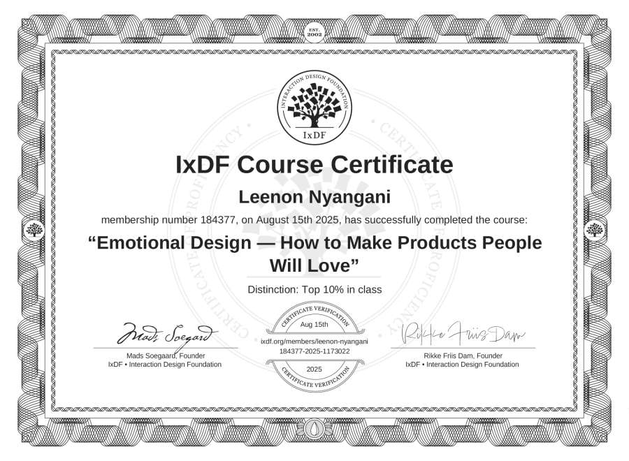 Leenon Nyangani's IxDF Course Certificate: Emotional Design — How to Make Products People Will Love