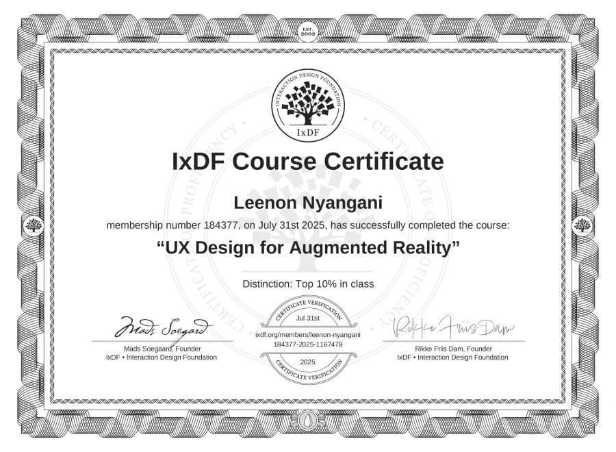 Leenon Nyangani's IxDF Course Certificate: UX Design for Augmented Reality