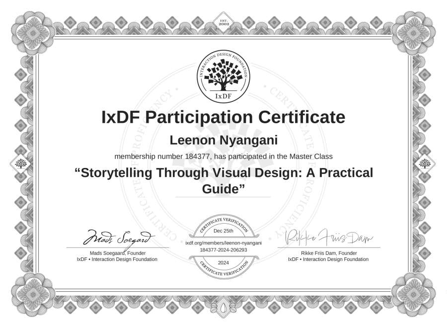 Leenon Nyangani's IxDF Masterclass Certificate: Storytelling Through Visual Design: A Practical Guide