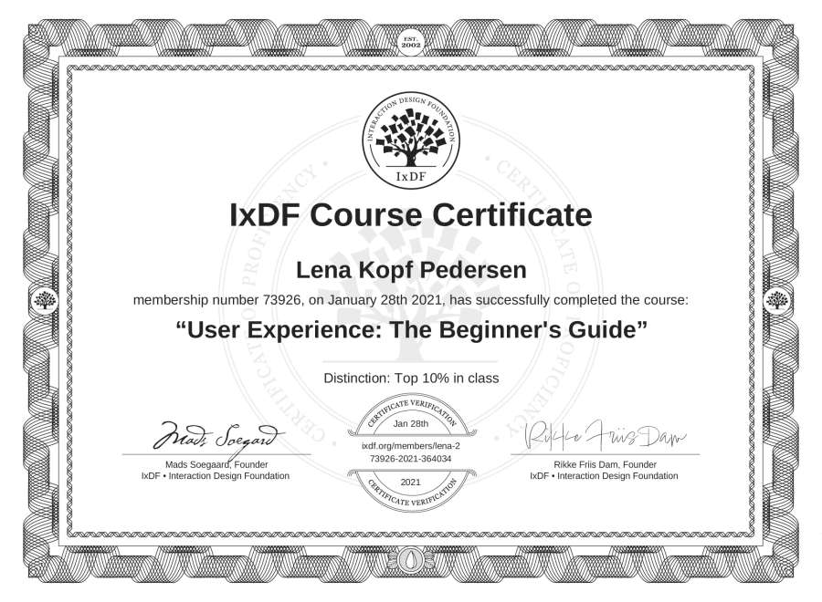 Lena Kopf Pedersen's IxDF Course Certificate: User Experience: The Beginner's Guide