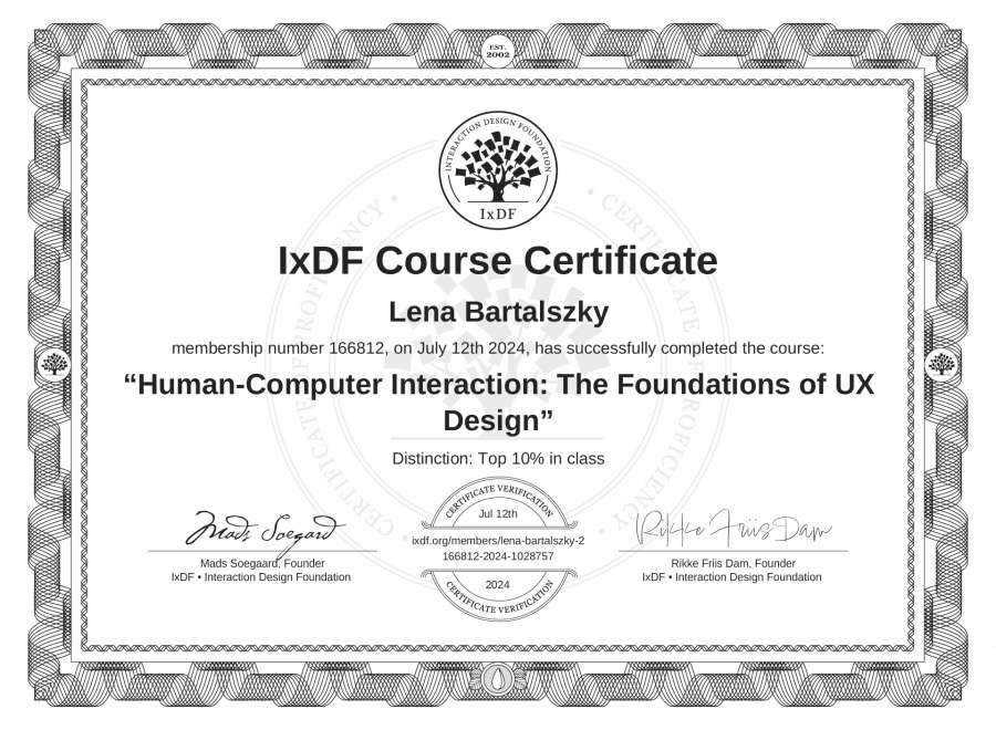 Lena Bartalszky's IxDF Course Certificate: Human-Computer Interaction: The Foundations of UX Design