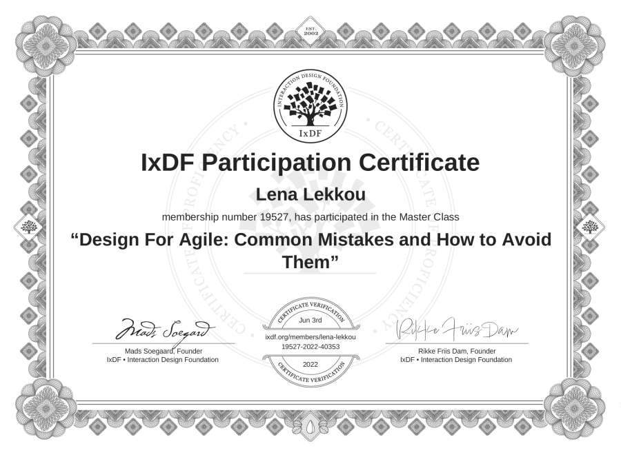 Lena Lekkou's IxDF Masterclass Certificate: Design For Agile: Common Mistakes and How to Avoid Them