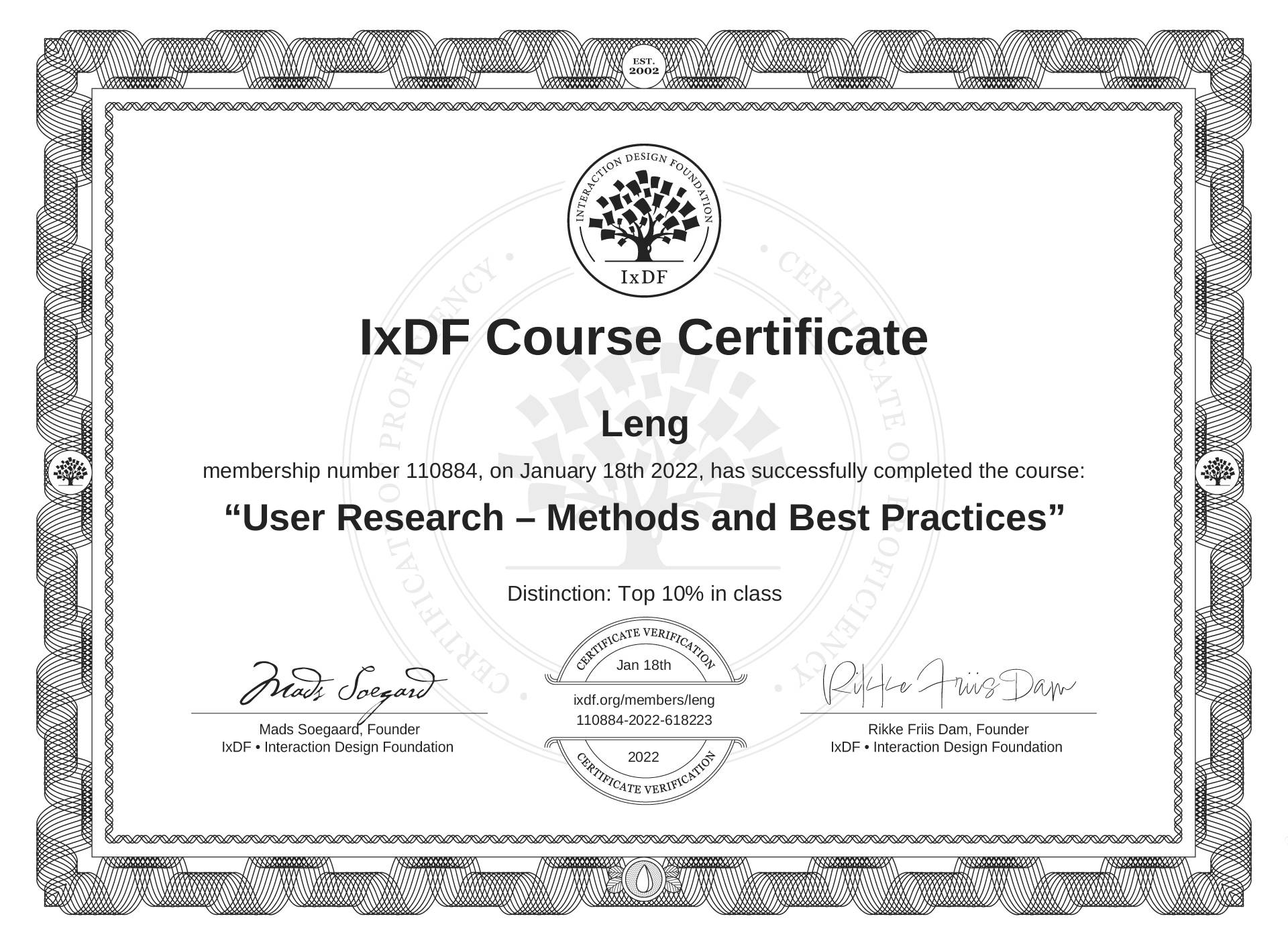The IxDF Course Certificate above is awarded to Leng with a Top 10% Distinction in formal recognition of their coursework surpassing the rigorous benchmarks of exceptional performance established by the IxDF Educational Codex.