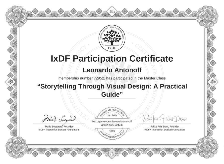 Leonardo Antonoff's IxDF Masterclass Certificate: Storytelling Through Visual Design: A Practical Guide