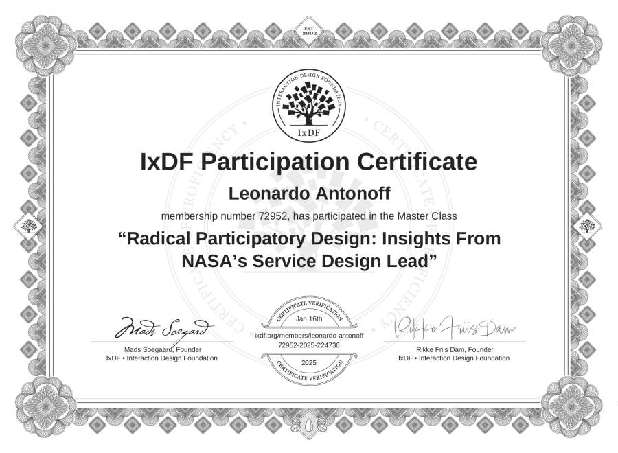 Leonardo Antonoff's IxDF Masterclass Certificate: Radical Participatory Design: Insights From NASA’s Service Design Lead