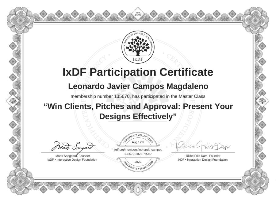 Leonardo Javier Campos Magdaleno's IxDF Masterclass Certificate: Win Clients, Pitches and Approval: Present Your Designs Effectively