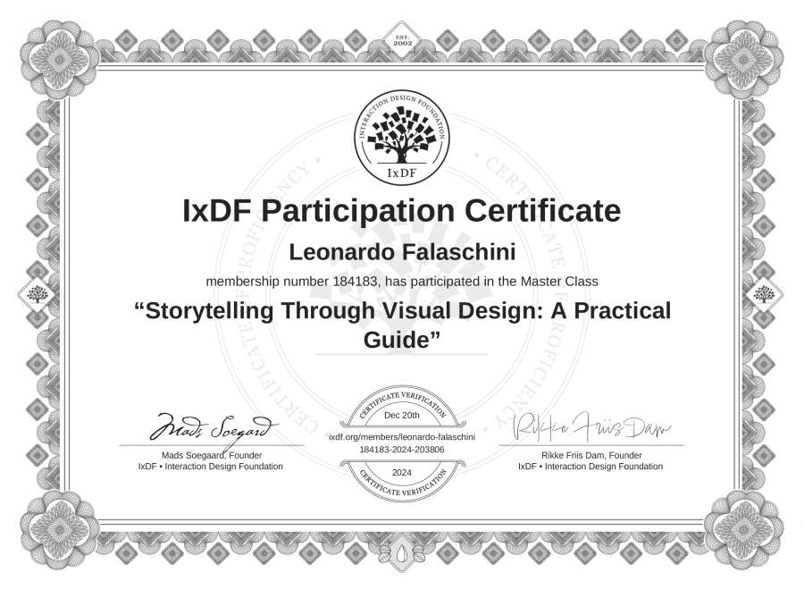 Leonardo Falaschini's IxDF Masterclass Certificate: Storytelling Through Visual Design: A Practical Guide