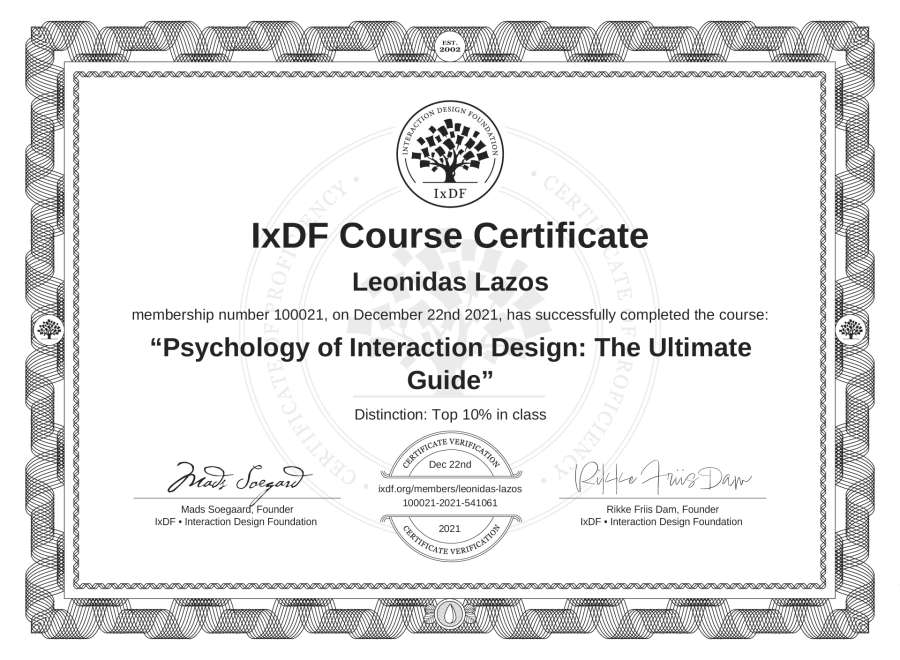 Leonidas Lazos's IxDF Course Certificate: Psychology of Interaction Design: The Ultimate Guide