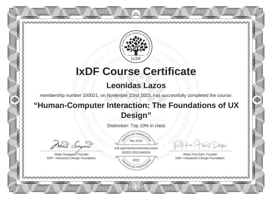 Leonidas Lazos's IxDF Course Certificate: Human-Computer Interaction: The Foundations of UX Design
