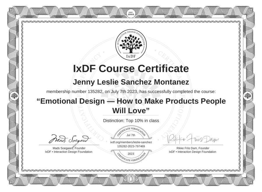 Jenny Leslie Sanchez Montañez's IxDF Course Certificate: Emotional Design — How to Make Products People Will Love