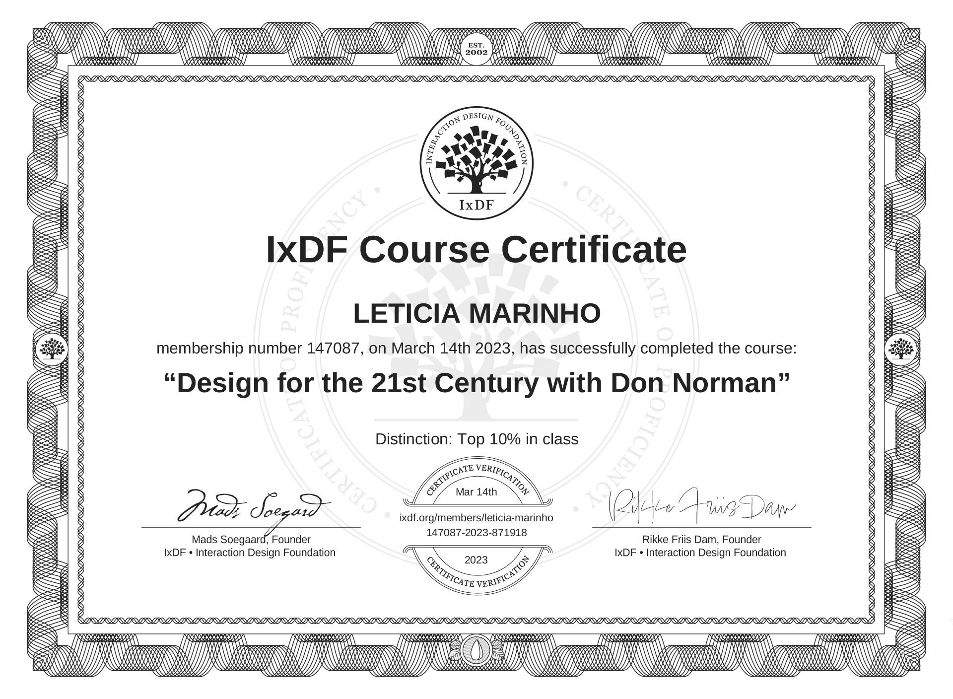 The IxDF Course Certificate above is awarded to LETÍCIA MARINHO with a Top 10% Distinction in formal recognition of their coursework surpassing the rigorous benchmarks of exceptional performance established by the IxDF Educational Codex.