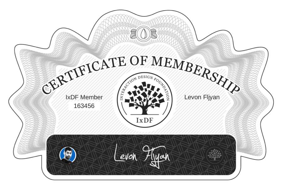 The Membership Certificate below verifies that Levon Fljyan is a member of Interaction Design Foundation.
