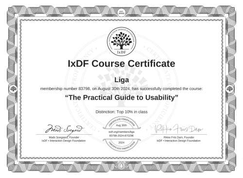 IxDF Course Certificates are awarded to Liga in formal recognition of their coursework surpassing the rigorous benchmarks of exceptional performance established by the IxDF Educational Codex.