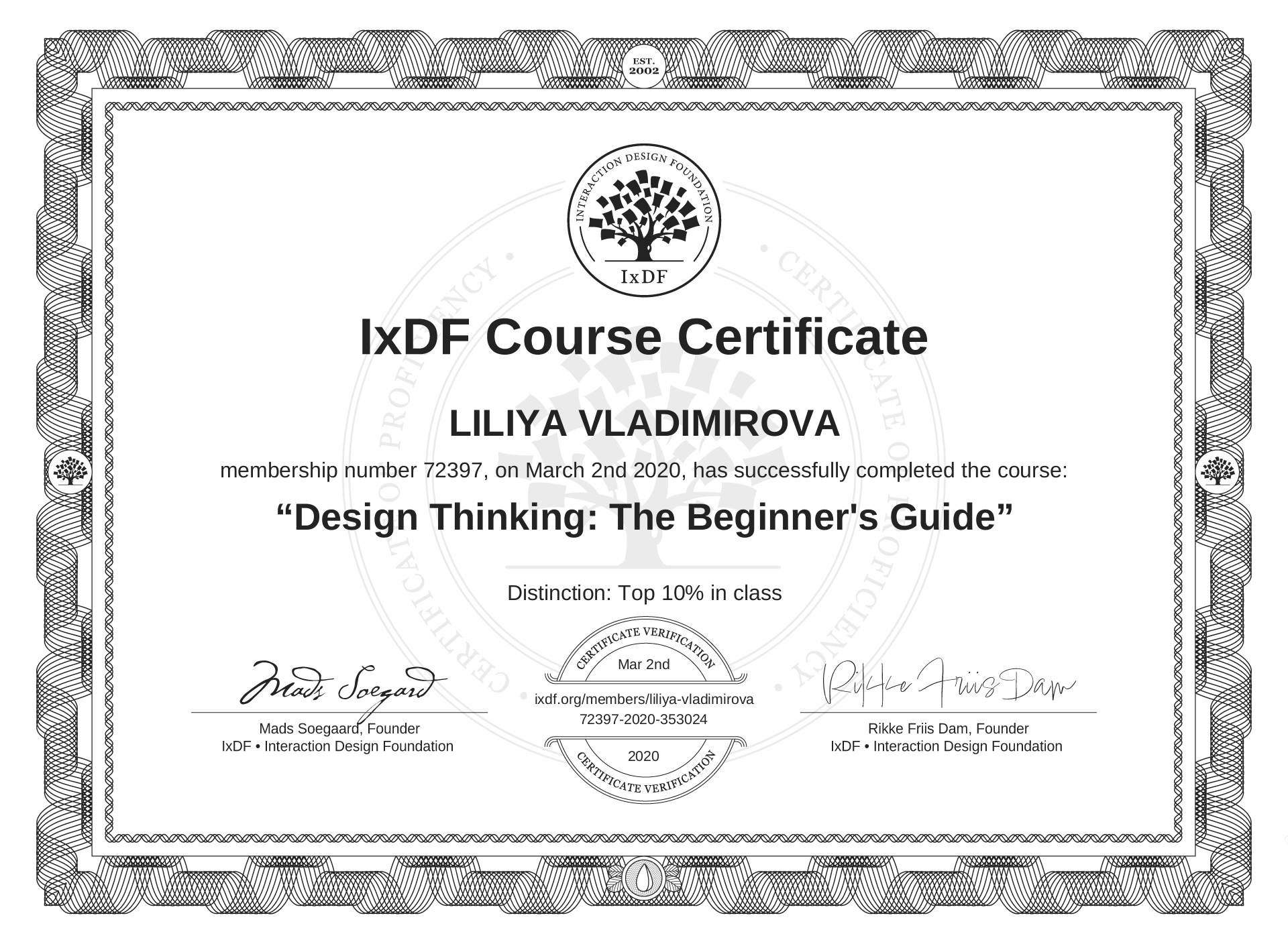 The IxDF Course Certificate above is awarded to LILIYA VLADIMIROVA with a Top 10% Distinction in formal recognition of their coursework surpassing the rigorous benchmarks of exceptional performance established by the IxDF Educational Codex.