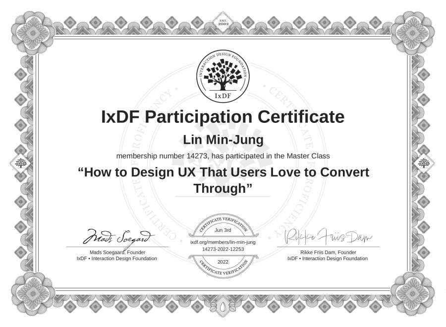 Lin Min-Jung's IxDF Masterclass Certificate: How to Design UX That Users Love to Convert Through