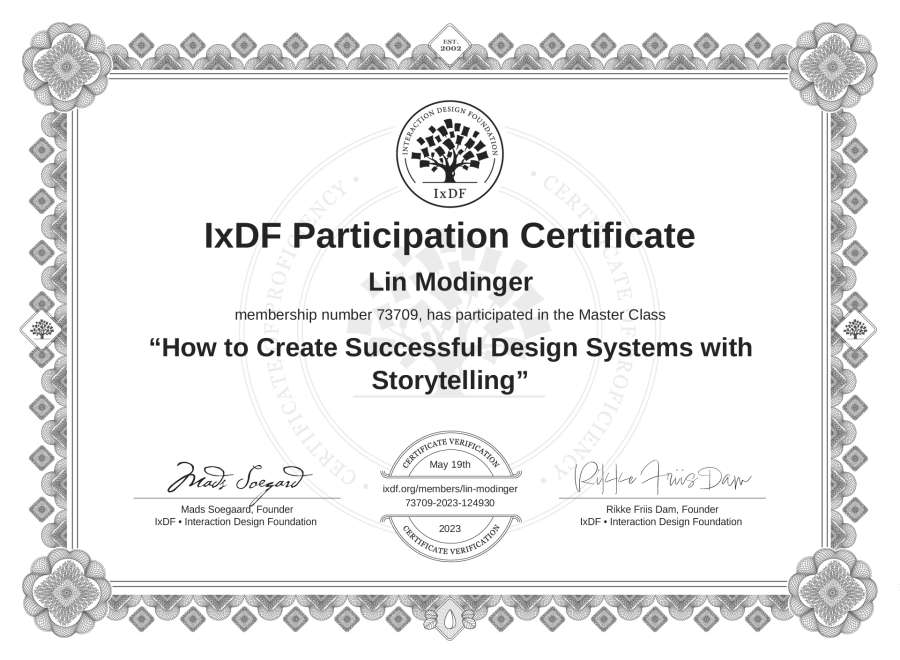 Lin Modinger's IxDF Masterclass Certificate: How to Create Successful Design Systems with Storytelling