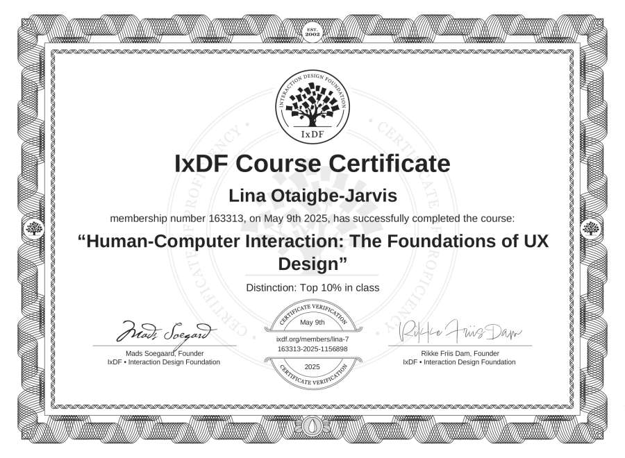 Lina Otaigbe-Jarvis's IxDF Course Certificate: Human-Computer Interaction: The Foundations of UX Design