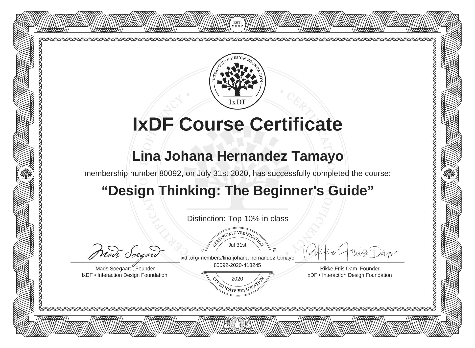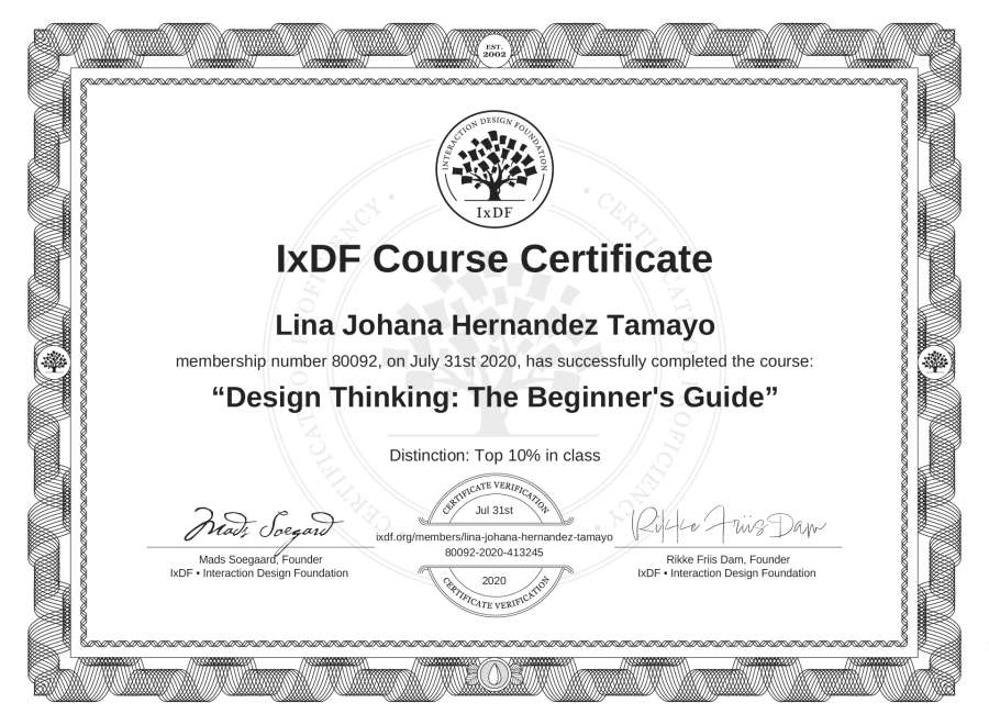 The IxDF Course Certificate above is awarded to Lina Johana Hernandez Tamayo with a Top 10% Distinction in formal recognition of their coursework surpassing the rigorous benchmarks of exceptional performance established by the IxDF Educational Codex.