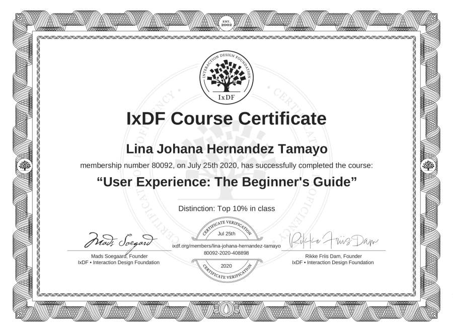 The IxDF Course Certificate above is awarded to Lina Johana Hernandez Tamayo with a Top 10% Distinction in formal recognition of their coursework surpassing the rigorous benchmarks of exceptional performance established by the IxDF Educational Codex.